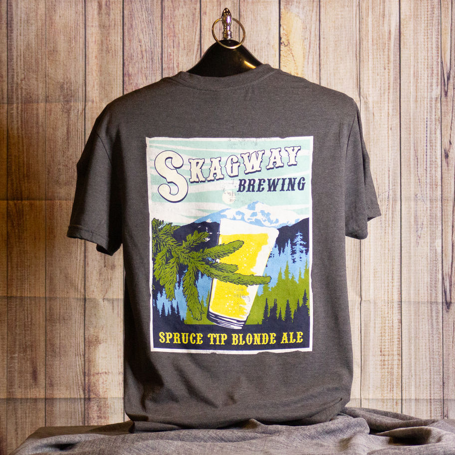 Soft style tee with Skagway Brewing logo on left chest and full retro style spruce tip logo on the back. Comes with our interp wrap that shares Skagway Brewing's history with Spruce Tips. Available in two colors - Heathered Charcoal and Olive Moss Green. NOTE: The image shown on display is our FORMER color (evergreen). Will have new pics taken soon!